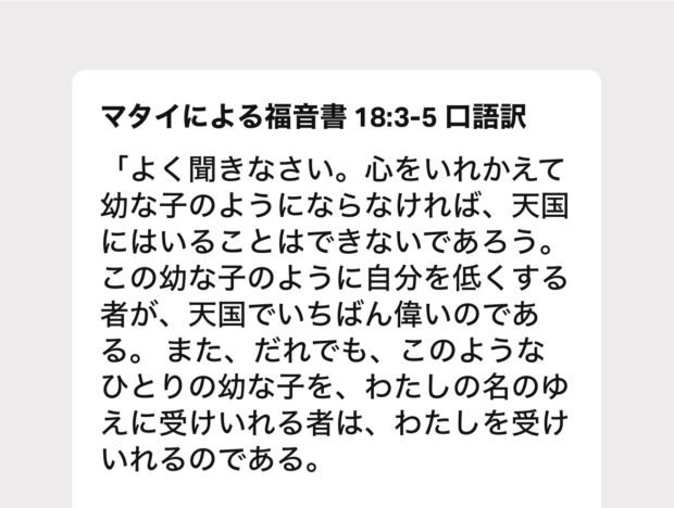 幼い子供は、野望、自慢や傲慢さに欠けています。だから私たちにとって良い見本なのです。我々大人は、私を含めてお金の心配、見栄、虚栄心、妬みをどうしても持っており、汚い部分があります。