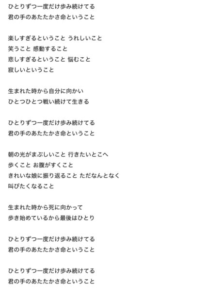 私は歌詞カードを見ながら涙が止まりませんでした。失恋直後、意気消沈していた私を立ち上がらせてくれたのは間違いなく、この「生きる」という曲でした。
