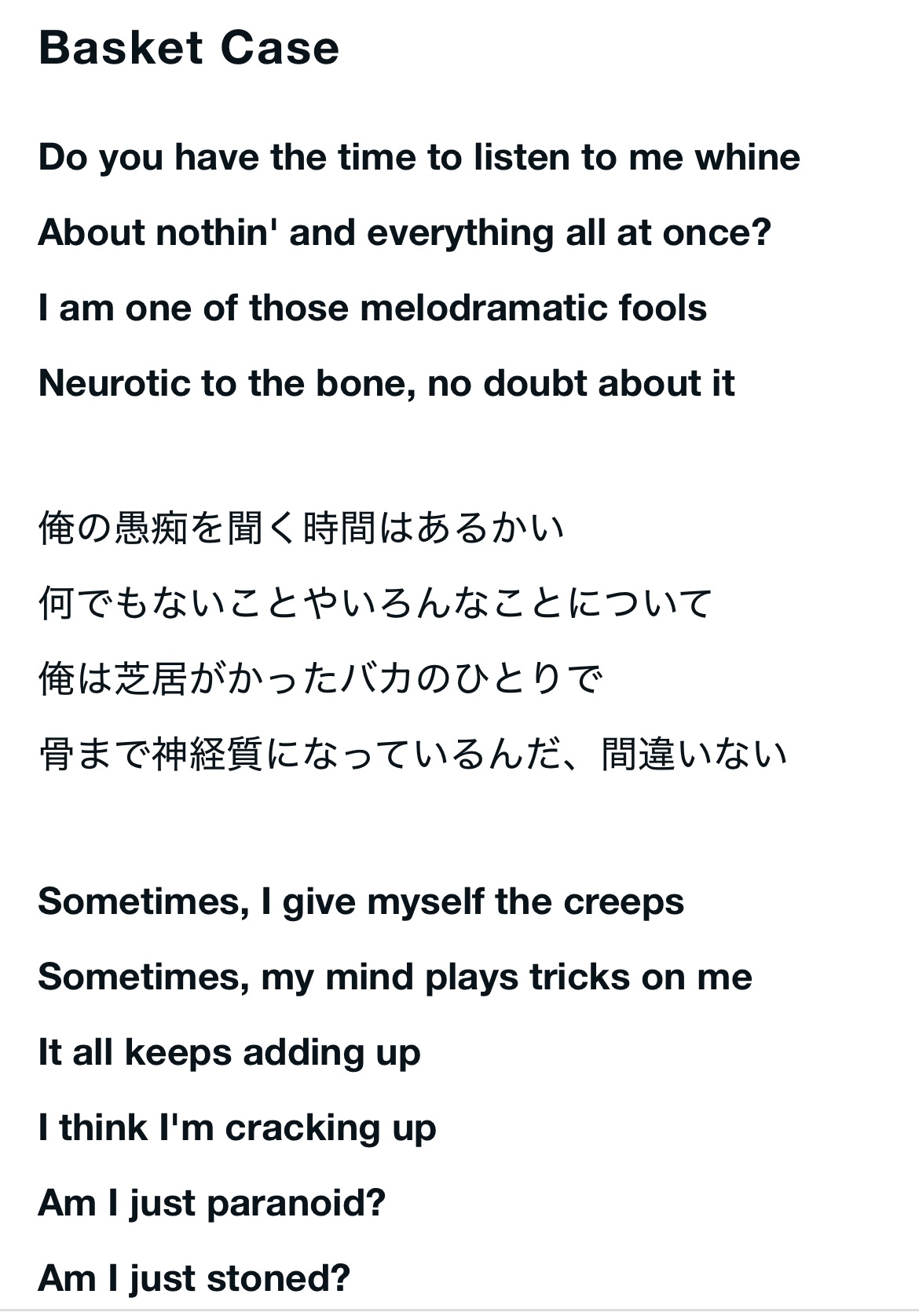 バスケットケースとは「手足を切断された症例」を意味するようで、分かりやすく言えば、「心理的に身動きが取れない状態」を表しています。ミュージック・ビデオも精神科病棟をモチーフにしており、精神的に弱った状態を歌ったものです。