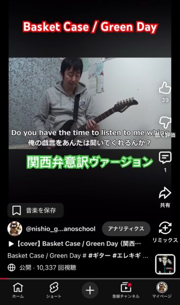 先日YouTubeのショート動画に投稿したGreen DayのBasket Caseの関西弁意訳ヴァージョンのショート動画の再生数が10,000再生を突破しました。
