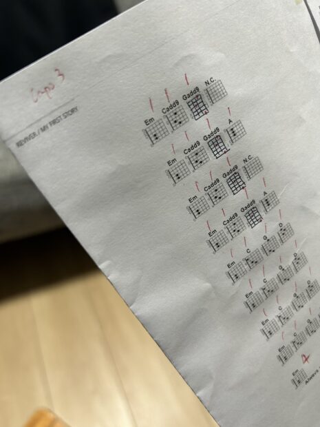 Tくんは事前にコード進行をしっかり確認し、譜面に書き込みを入れて準備してきました。