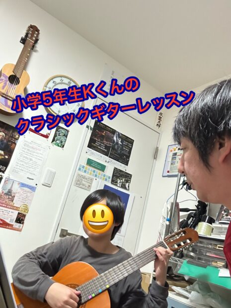 今日のレッスンは小学4年生Kちゃんでした。現在、ギターソロに入り一生懸命にギター …