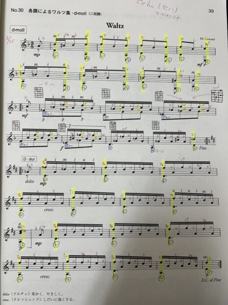 Yくんはギターを始めてから、少しずつ指の使い方や音の出し方が安定してきており、今回のレッスンではクラシックギターの基礎教材でもよく使われる 「ワルツ(F.カルリ)」 に取り組みました。