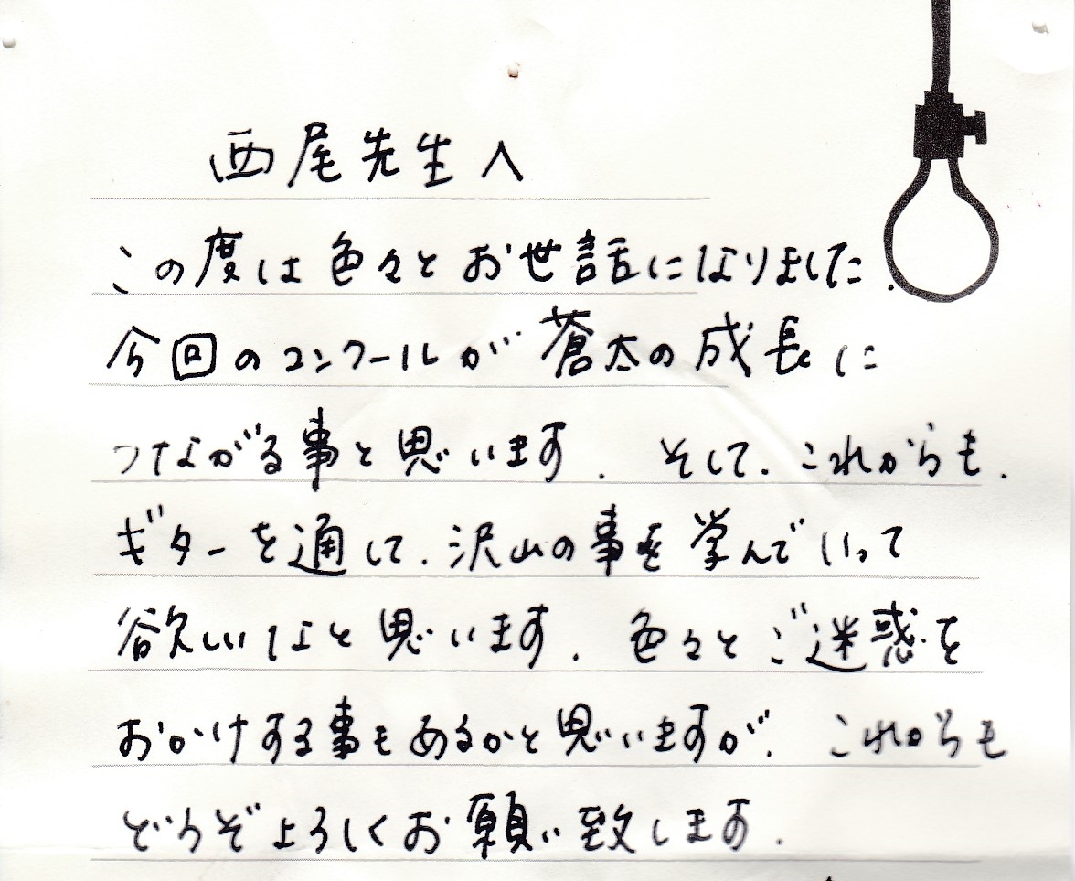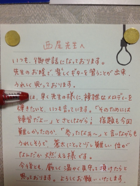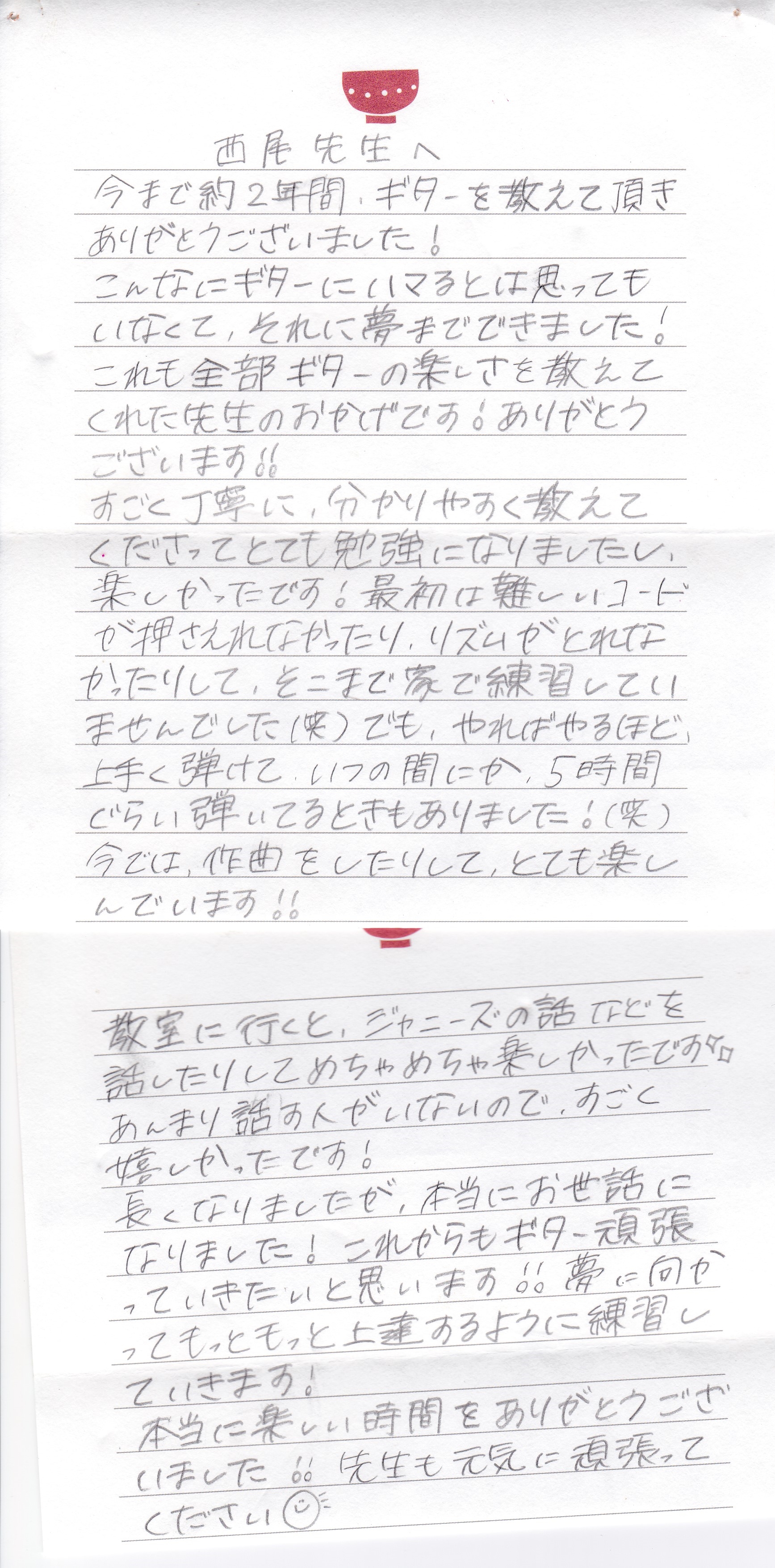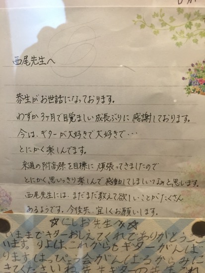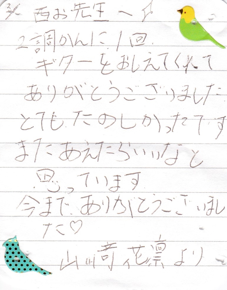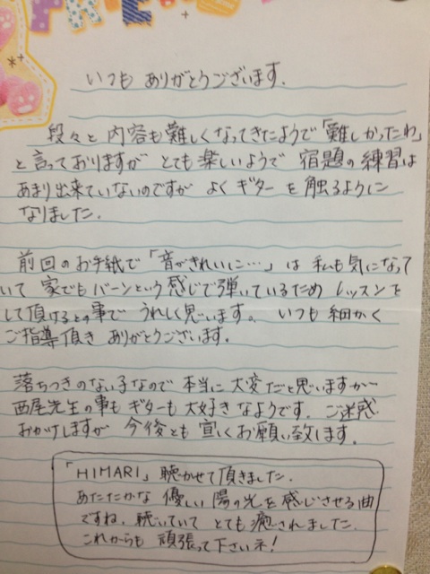 生徒さんからのお手紙 生徒さんから頂いたお手紙を掲載させていただきます。(※生徒さんの許可を得て掲載しています)・スマホで見る場合、画像をタップすると別ページに行き、もう一度画像をタップすると拡大表示されます。・パソコンで見る場合はマウスを画像の真上に置き、左クリックすると別ページに行き、もう一度画像を左クリックすると拡大表示されます。
