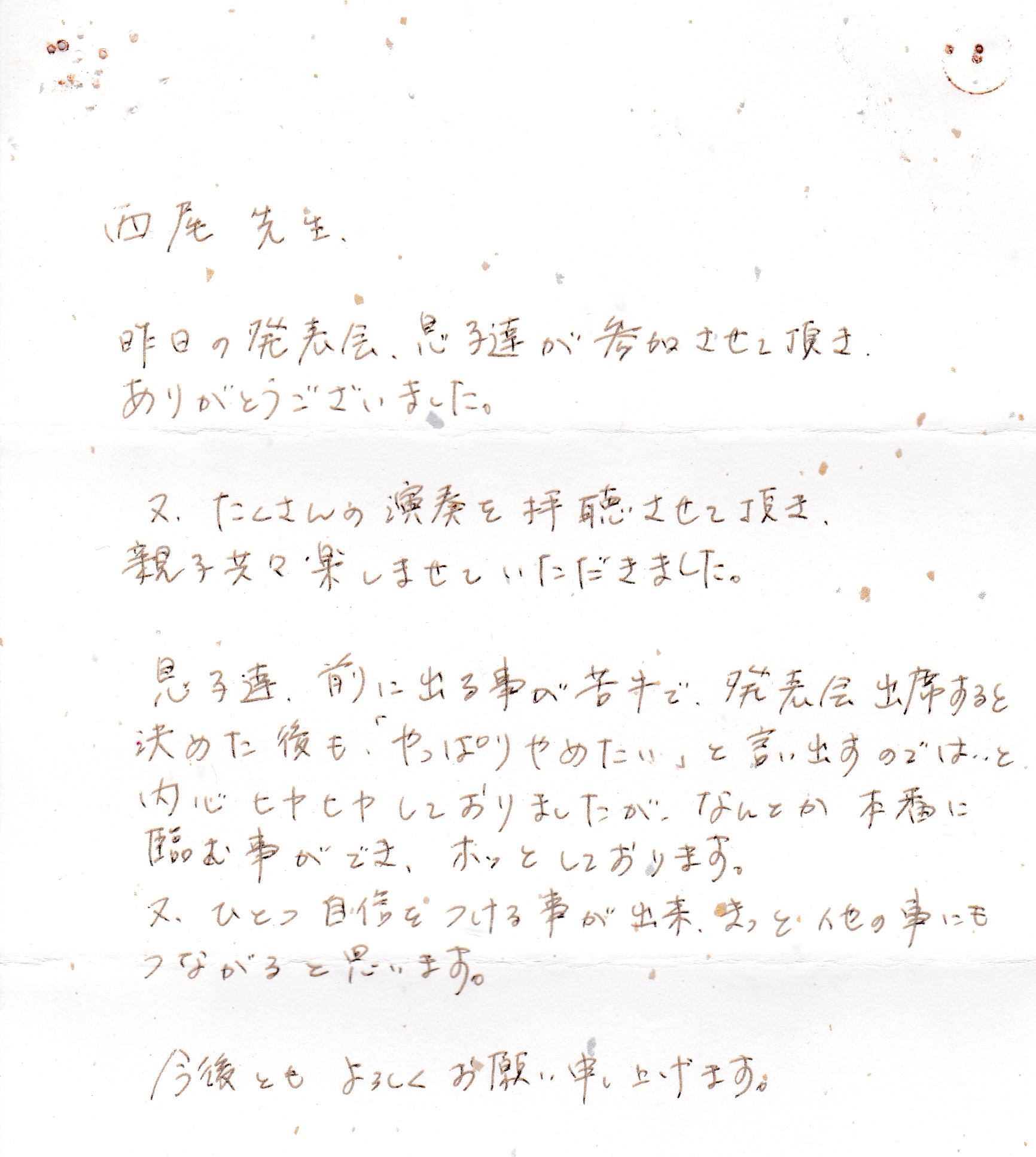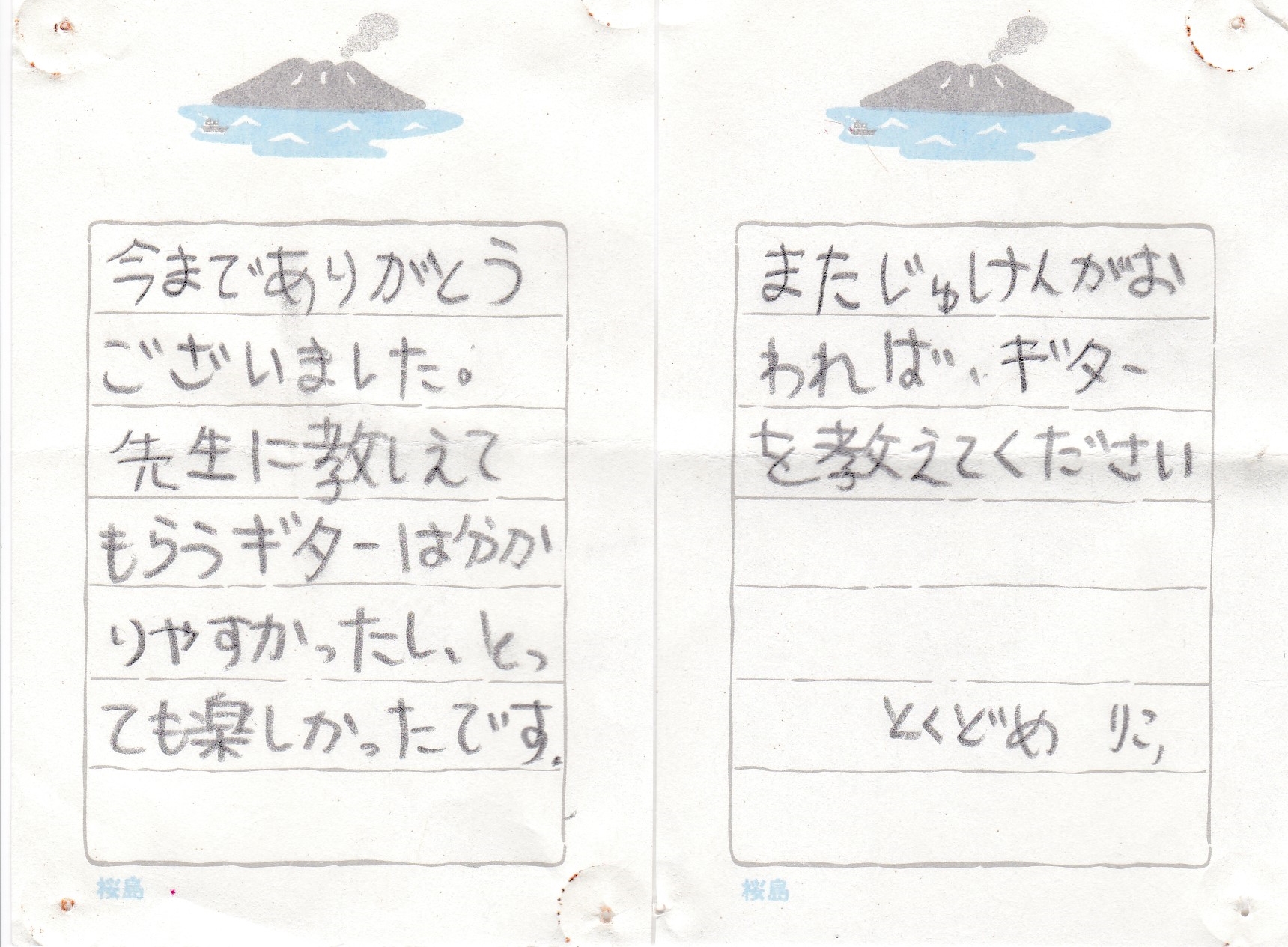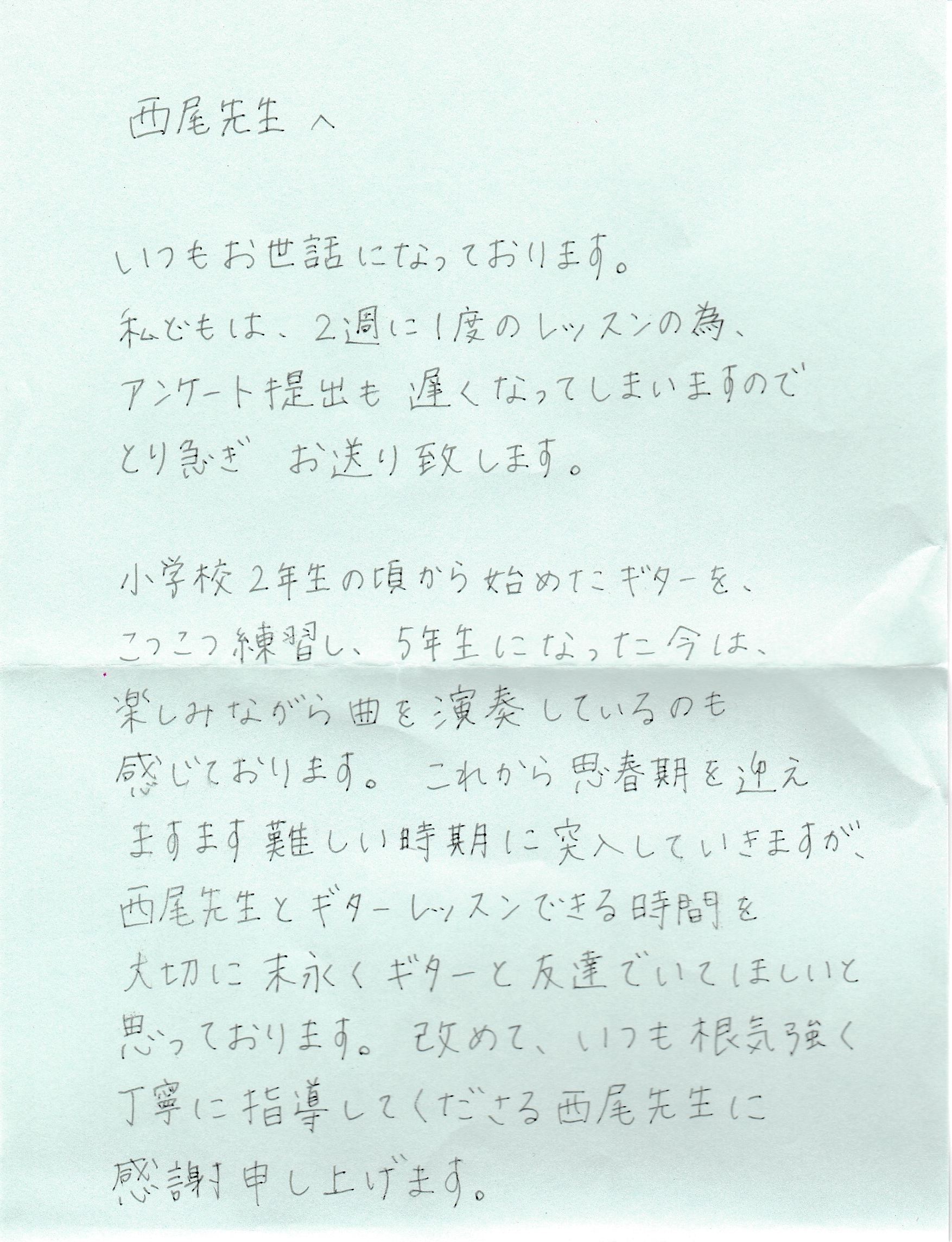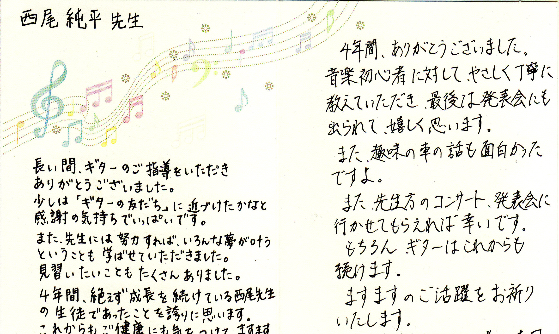 生徒さんからのお手紙 生徒さんから頂いたお手紙を掲載させていただきます。(※生徒さんの許可を得て掲載しています)・スマホで見る場合、画像をタップすると別ページに行き、もう一度画像をタップすると拡大表示されます。・パソコンで見る場合はマウスを画像の真上に置き、左クリックすると別ページに行き、もう一度画像を左クリックすると拡大表示されます。